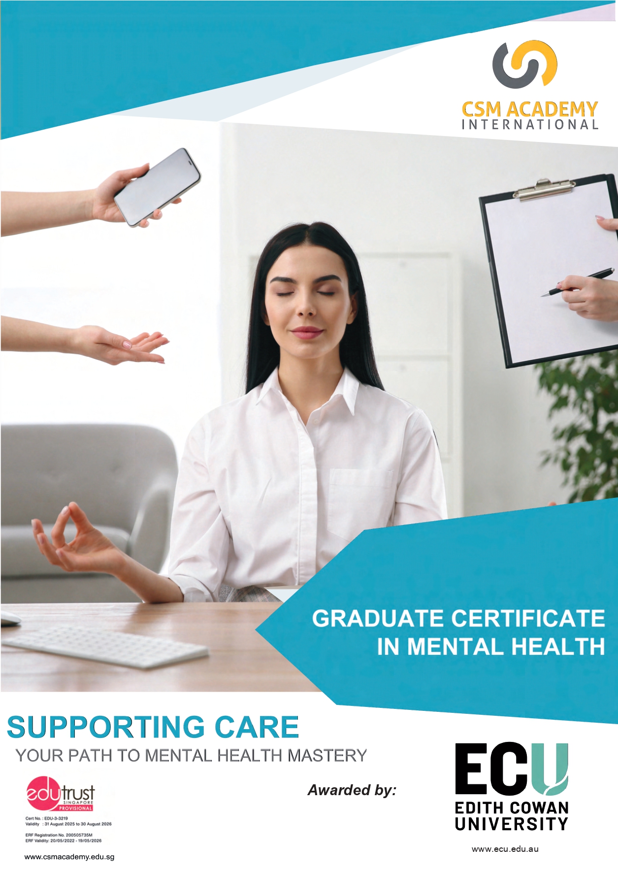 - Gain a comprehensive global perspective with insights from international tutors at Edith Cowan University and local senior leaders in Singapore, providing a unique opportunity to gain diverse world experience in tackling complex mental health challenges.